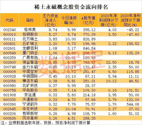资金流向数据显示,稀土永磁概念主力资金今日合计净流入22.84亿元,资金重点抢筹行业龙头股,格林美、包钢股份、北方稀土、五矿稀土、厦门钨业、广晟有色等7只大市值股获主力资金净买入超亿元。