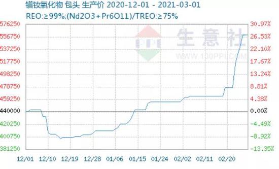 稀土永磁概念一直是A股热门题材之一。一方面是由于稀土的战略性资源属性,另一方面,下游行业需求增长催生了稀土行业景气度。据悉,自去年5月份以来稀土价格开启了新一轮的涨价周期,氧化镨钕等稀土价格自低点以来涨幅均在50%左右。