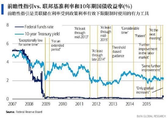 随后,美联储由定量指导转向了定性指导。2014年3月,美联储指出,在资产购买计划结束后,利率将在相当长一段时间内保持在低位。2014年12月,美联储表示利率正常化的道路上应保持耐心,并没有给到一个明确的目标。