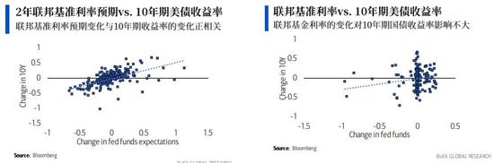的确,从下图可以看出,10年收益率的变化与联邦利率的预期变化之间存在正相关关系,而与联邦基金利率的实际变化几乎没有关系。
