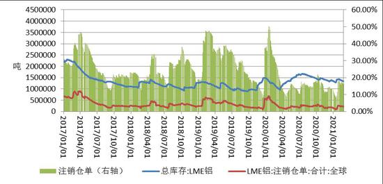 截至2021年2月25日,LME铝库存为1332525吨,较上月减少98525吨,或-6.88%。2020年同期库存为1082150吨。2月库存水平处于5年同期的第4低位。,LME铝注销仓单为215050吨,较上月减少36500吨,或-14.51%。2020年同期注销仓单为290300吨。2月注销仓单水平处于5年同期的最低位。,LME铝库存注销仓单占比为16.14%,较上月减少1.44个百分点。2020年同期注销仓单占比为26.83%。2月注销仓单占比处于5年同期的最低位。