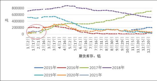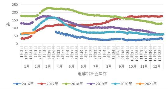 社会库存方面,截至2月25日,SMM统计的5地电解铝社会库存为108.2万吨,较上周增加18.10万吨。去年同期库存为138.5万吨。当前库存处于5同期的第2低位。从图中可以看出,目前铝的社会库存累计程度不及往年的同期,表明需求尚可。除了汽车市场表现向好外,“就地过年”政策对于铝库存的消耗也起到了积极作用,由于大部分工人均没有回家过年,因此在春节假期结束后,下游企业的复工复产会比往年要快。