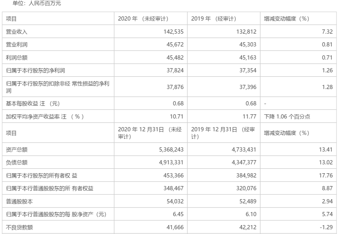 最新2020年业绩快报显示,光大银行截至2020年末光大银行总资产为53682.43亿元,同比增长13.41%。全年实现营业收入1425.35亿元,增长7.32%;归属于股东的净利润378.24亿元,增长1.26%。
