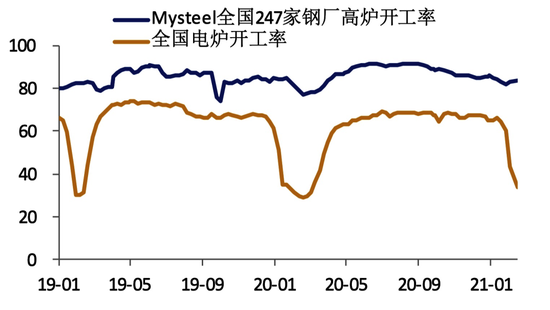 今年已经过去两个月,虽然全国粗钢产量尚未公布,但从高频数据看,增速依然居高不下。据中钢协统计,年初至2月中旬,全国累计粗钢产量1.46亿吨,同比增长9.07%。根据我的钢铁网周度数据,1-2月份五大钢材品种累计产量0.93亿吨,同比增长8.36%。两者取平均值,我们预计1-2月全国粗钢产量同比增长8.7%至1.68亿吨。