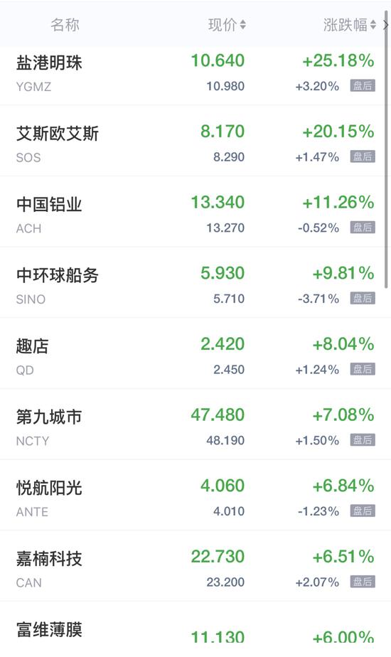 此外,中国铝业涨超11%,趣店涨超8%,南方航空涨超5%,中石化涨超3%。