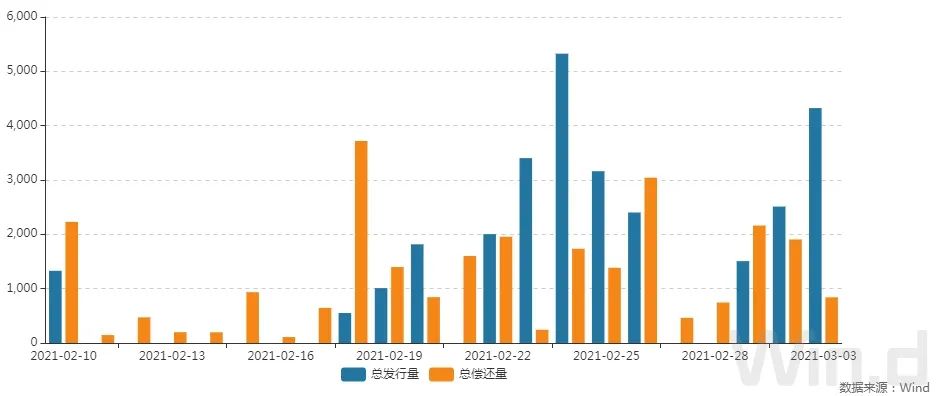3月3日,债券市场共发行320只债券,总发行量4323.46亿元,122只债券到期,19只债券提前兑付,1只债券回售,1只债券赎回,总偿还量841.51亿元,当日净融资额为3481.96亿元。