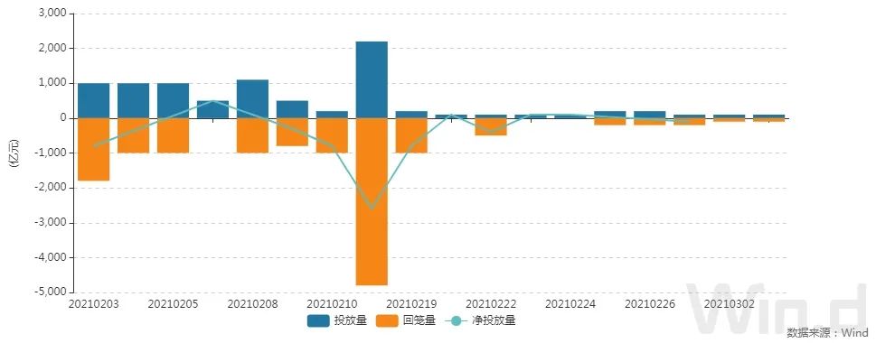 央行公告称,为维护银行体系流动性合理充裕,3月3日以利率招标方式开展了100亿元7天期逆回购操作,中标利率2.20%。Wind数据显示,当日100亿元逆回购到期,完全对冲到期量。