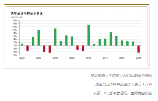 金价的总体负增长势头也是其2021年初表现低迷的重要因素。金价自去年8月初创下超2000美元/盎司的历史新高后,一直处于下跌趋势,同一时期随着美国大选后市场情绪的好转以及数只新冠疫苗的成功研发,投资者也加大了对风险资产的投资力度。