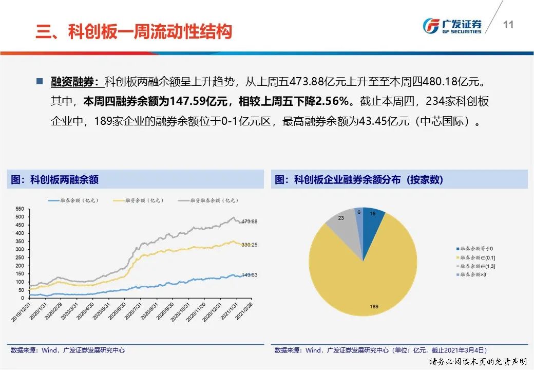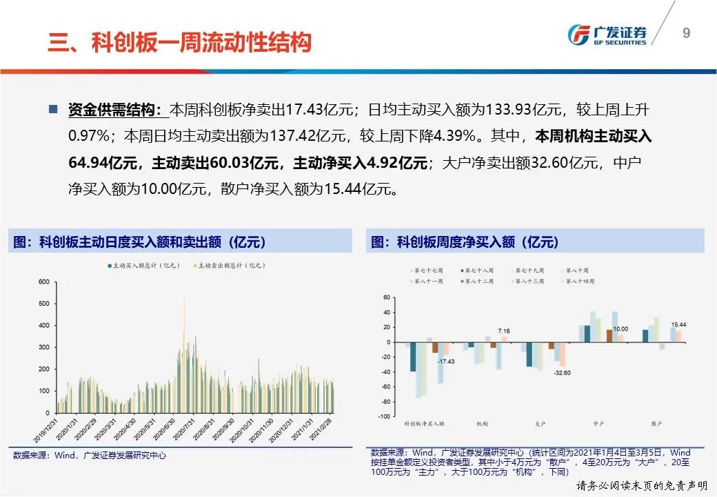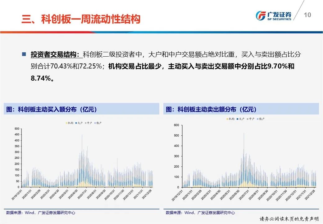 一周流动性结构:(1)本周科创板净卖出17.43亿元,机构主动买入4.92亿元;(2)机构本周主动买入与卖出交易额中分别占比9.70%和8.74%;(3)本周四融券余额为147.59亿元,相较上周五下降2.56%,融券/融资余额比为0.44。
