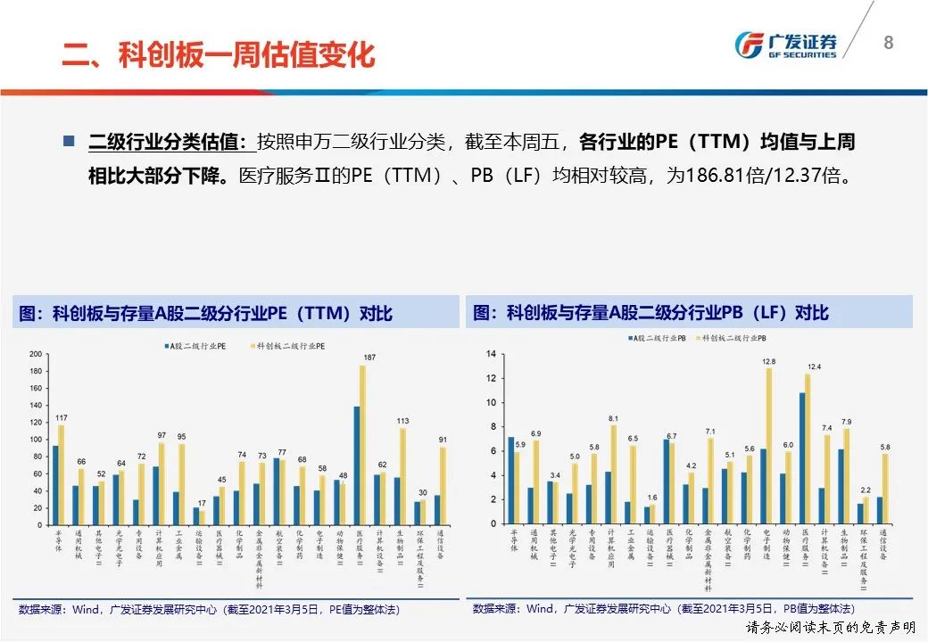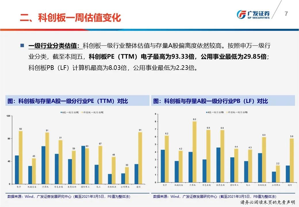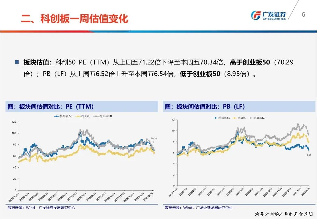 一周估值变化:(1)科创50 PE(TTM)从上周五71.22倍下降至本周五70.34倍;(2)科创板PE(TTM)电子最高为93.33倍,公用事业最低为29.85倍。