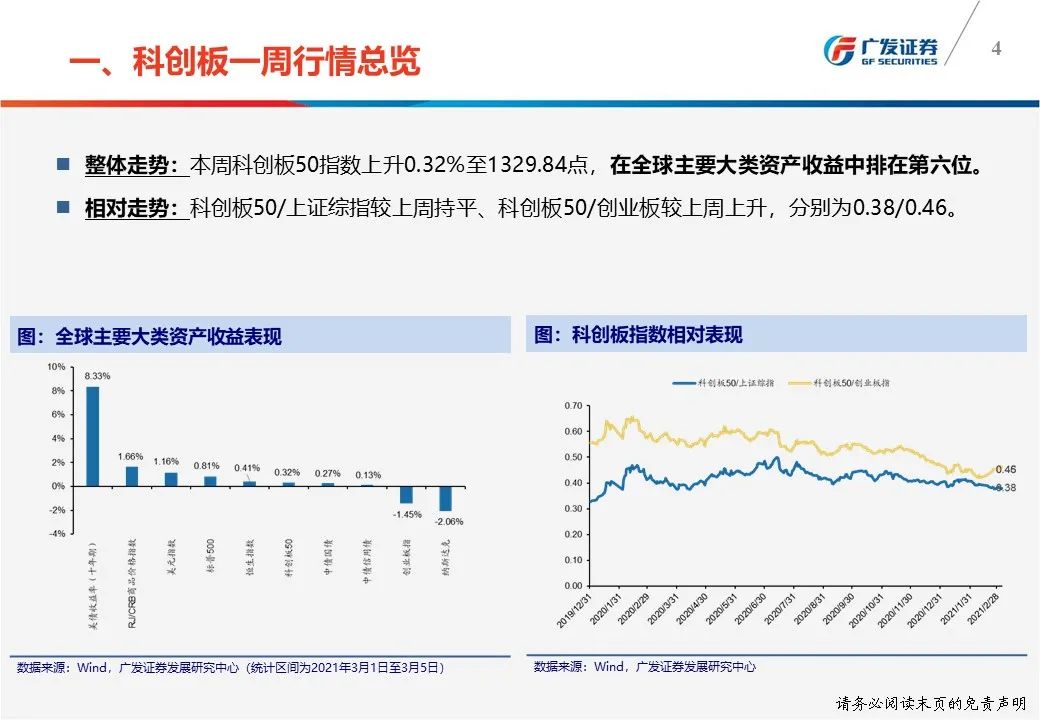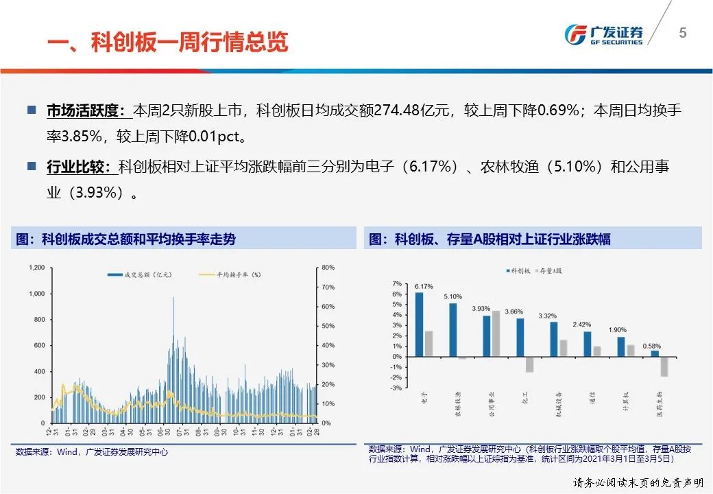 一周行情总览:(1)科创板50指数本周上升0.32%至1329.84点;(2)本周日均成交额274.48亿元,较上周下降0.69%;本周日均换手率3.85%,较上周下降0.01pct。