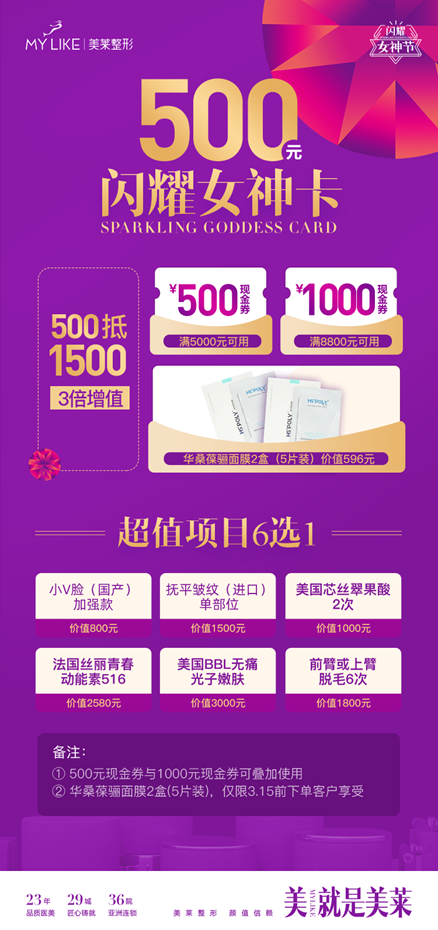 美莱耀你美不设限,特倾情推出500元女神特权卡:500抵1500三倍增值,加赠千元热门项目(6选1),3月15日前下单,还可再赠¥298华桑葆骊面膜2盒。