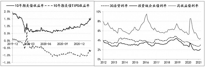 同时正如本文首段所述,很多高频经济指标释放出经济复苏较强的信号。而经济复苏预期的强化,基本从今年2月中旬以来美债实际收益率的上升得到了体现,10年期美债实际收益率由-1.06%最高升至-0.6%,累计提升了46BPs,而同期10年美债名义收益率由1.15%最高升至1.61%,累计提升了46BPs,表明美债名义收益率的上行完全是由实际收益率推动的。但同期无论是事关个人融资成本的房贷利率,还是事关实体企业融资成本的企业债利率,并没有跟随美债实际利率快速上升。例如,目前美国30年期抵押贷款固定利率仅为3.02%,仍低于疫情前3.7%的水平,美国投资级企业债利率为2.18%,低于疫情前2.9%的水平,美国高收益企业债利率为4.45%,也低于疫情前5.3%的水平。