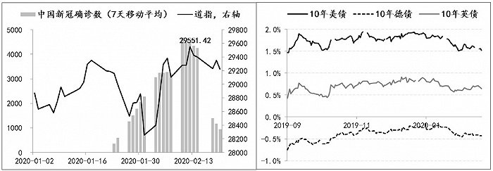 在经济向好情绪主导下,该阶段市场主线始终是对全球经济“复苏加强”的定价。即便是疫情已在中国集中爆发之后,欧美发达市场的股指还是创出新高,例如美国道琼斯指数最先于2020年2月12日首次突破29550点,一周后(2月18日)纳斯达克指数和标普500指数也创出历史新高。与股指连创新高同步,欧美发达国家10年期国债收益率开始上行,10年期美债收益率由1.47%升至1.93%,10年期德债收益率由-0.75%升至-0.16%,10年期英债收益率由0.43%升至0.9%。