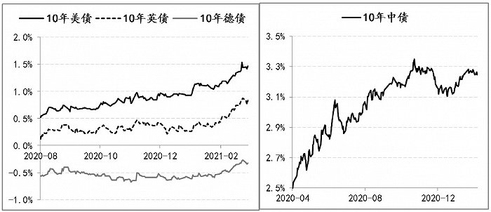 2020年8月份之后,首先是中国经济基本完成了产出缺口的修复,加之疫苗研发进展顺利,集中于供给端的投资需求出现趋势性回暖,市场信心也得到持续改善,商品市场进入上升周期,商品价格同比涨幅一举扭转了持续两年多的负增长,转入正增长且速度很快,之后公布的2020年3季度各国经济的反弹增速均是历史新高,以及美联储在2020年8月份将其政策框架调整为“平均通胀目标制”,明确向市场传递出其大幅提高了对通胀的容忍度,在这些因素叠加助推下,市场通胀预期得到了明显改善,相应推动不少国家的10年期国债利率从2020年8月4日左右的低位开始显著回升,截至目前(2021年3月6日),10年期美债收益率累计上行了100BPs以上、10年期德债收益率累计上行了30BPs、10年期英债收益率累计上行了75BPs,而中国由于是率先复苏的,因此利率环境的回归早于其他国家,是从2020年4月底开始的,由2.5%回升至3.28%,累计上行了78BPs。