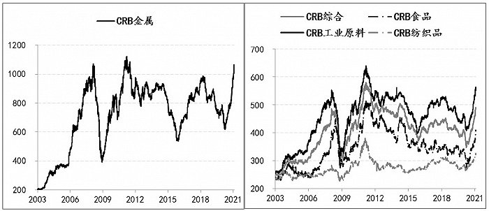 2020年11月以来,多国的多款疫苗陆续上市和接种的开展,美国大选后民主党主政测“蓝潮”政局的形成,都令市场开始对2021年夏天实现“群体免疫”有了越来越强的预期,与此同时,包括G7峰会和G20部长会议均强调了要保持政策对冲力度不减,中国虽然启动政策淡出,但也强调了“政策不急转弯”,尤其是2021年1月中下旬全球新增确诊人数出现拐点后开始快速下降,均强化了市场对于2021年经济前景的改善。因此,近四个月来,价格上涨的商品范围持续扩大,上涨速度也更快,例如,CRB综合指数以及食品、工业原料、纺织品等分项指数均已接近2014年的峰值,而CRB金属指数则已更是接近本世纪以来的峰值(2011年)。