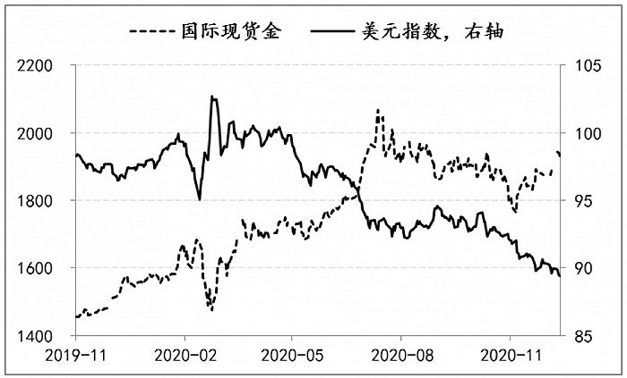 其次,宽松的财政政策直接表现为各国政府债务的激增,全球无风险资产的规模迅速攀升,与此同时,出于对债务问题的担忧,尤其是对美国债务可持续性的质疑,美元指数出现了明显的一波下行,由103最低降至89.22,而国际金价由1451美元/盎司最高升至2075.14美元/盎司。