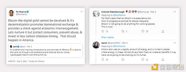 “比特币就像数字黄金不会贬值,它是去中心化的,能促进跨国交易,并且为经济管理不善提供风险对冲。让我们发展这个行业吧,保护消费者、防止滥用、投资碳排放更少的比特币挖矿吧。美国应该这么做。”Ro Khanna于上周三在一条推文中写道。