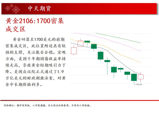 基本面概述:宏观方面,美国十年期国债收益率持续走高,导致黄金短期吸引力下降。美国众议院正式通过了1.9万亿美元的财政刺激法案,对黄金中长期价格利多。