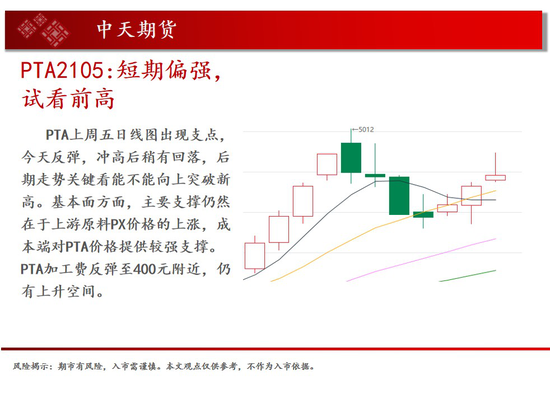 基本面概述:基本面方面,主要支撑仍然在于上游原料PX价格的上涨,成本端对PTA价格提供较强支撑。PTA加工费反弹至400元附近,仍有上升空间。