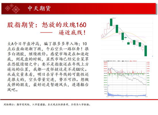 操作建议:大A今日早盘冲高,骗了很多多单入场;10点后盘面逐渐下跌,午后空头一路狂奔!很多白酒股,继续跌停。感觉市场是在加速赶底,到尾盘的时候,显然市场已经完全笼罩在恐慌情绪之中;要不是指数还在年线上方遥远的位置,我都一度怀疑这是不是GU灾。从成交量来看,明日杀穿半年线的可能性还是很大的,空头带量突进,势不可挡。想做反弹的朋友,最好还是暂避风头,进港躲台风吧。