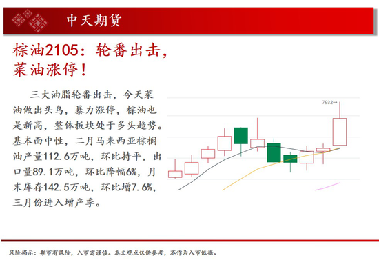 操作建议:三大油脂轮番出击,今天菜油做出头鸟,暴力涨停,棕油也是新高,整体板块处于多头趋势。