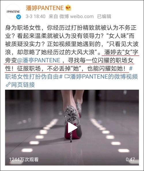 3月3日,妇女节前夕,著名日化品牌宝洁旗下的产品潘婷在其官方微博上发布了一支广告。