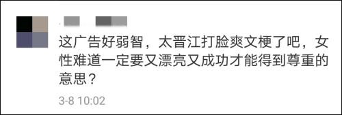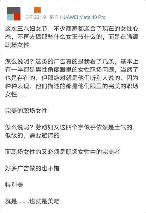 有网友总结到,“这次的三八妇女节,不少商家都迎合了现在的女性心态,不再去搞那些什么‘女王节’的,而是在强调职场女性”,但是做出来的广告“描述的都是他们眼里的完美的职场女性”,仍然是商家和广告人的自嗨。
