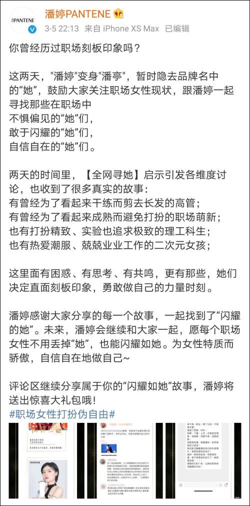 3月5日发布的微博,潘婷官微进一步解释称,暂时隐去品牌名中的“她”,是鼓励大家关注职场女性现状,寻找不惧偏见、敢于闪耀、自信自在的“她”们。