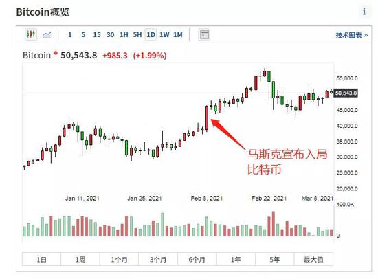 消息公布后,当时比特币价格大幅攀升,短短一个交易日,涨幅接近20%,而此前比特币价格在30000-40000美元区间波动。在该消息刺激下,比特币价格当天突破40000元震荡上限,收报46395.7美元,大涨19.41%,比特币价格持续走高,2月21日达到历史最高价58335.1美元,逼近60000美元大关,期间累计涨幅超50%。