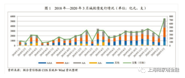 2020年一季度,城投债发行数量及规模同比环比均保持增长,共发行城投债1367支,同比、环比分别增加393支和156支;发行规模10362.82亿元,同比、环比分别增长34.55%和3.90%。其中,3月城投债发行支数和规模均为历史单月之最,分别为740支和5664.49亿元。