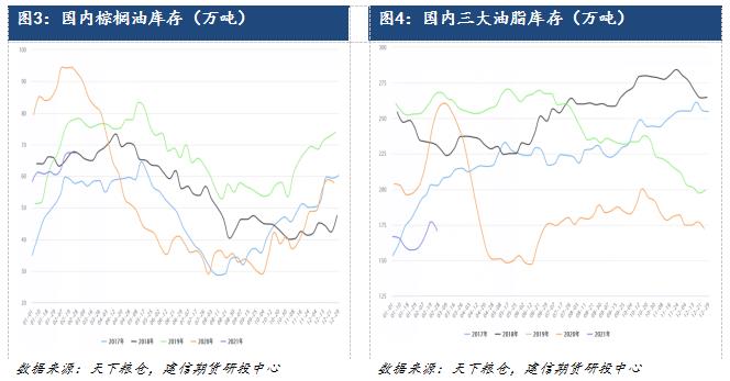 根据最新的USDA报告,2020/21年度棕榈油需求稳定增加,较上年度增加227万吨。分国别来看,欧盟和美国略微下降,欧盟主要是受生物柴油影响;印度增幅最大,达到130万吨,印度本国需求旺盛以及自有率始终不足,需要从全球市场采购补充,特别是棕榈油作为相对廉价油脂,价格吸引力一直存在。中国、巴基斯坦等棕榈油需求略增,持稳为主。我们重点关注主要消费区中国和印度库存并不充裕,一直在积极采购,虽然部分时期由于进口利润不佳情况下进口可能稍微放缓。