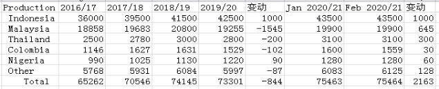 表1:2021年2月份公布的棕榈油产量情况(单位:千吨)