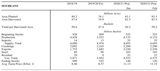根据最新的USDA报告,2020/21年度美豆播种面积8310万英亩,收获面积估计为8230万英亩,与上月报告持平,但高于上一年度的7500万英亩。面积数据其实也间接体现了高价和种植收益刺激豆农种植积极性。单产估计为每英亩50.2蒲式耳,与上月持平,高于上年的47.4蒲式耳。最终产量为41.35亿蒲式耳,也未调整。由于出口上调了0.20亿蒲式耳,导致期末结转库存下调,报告对大豆市场影响偏多。