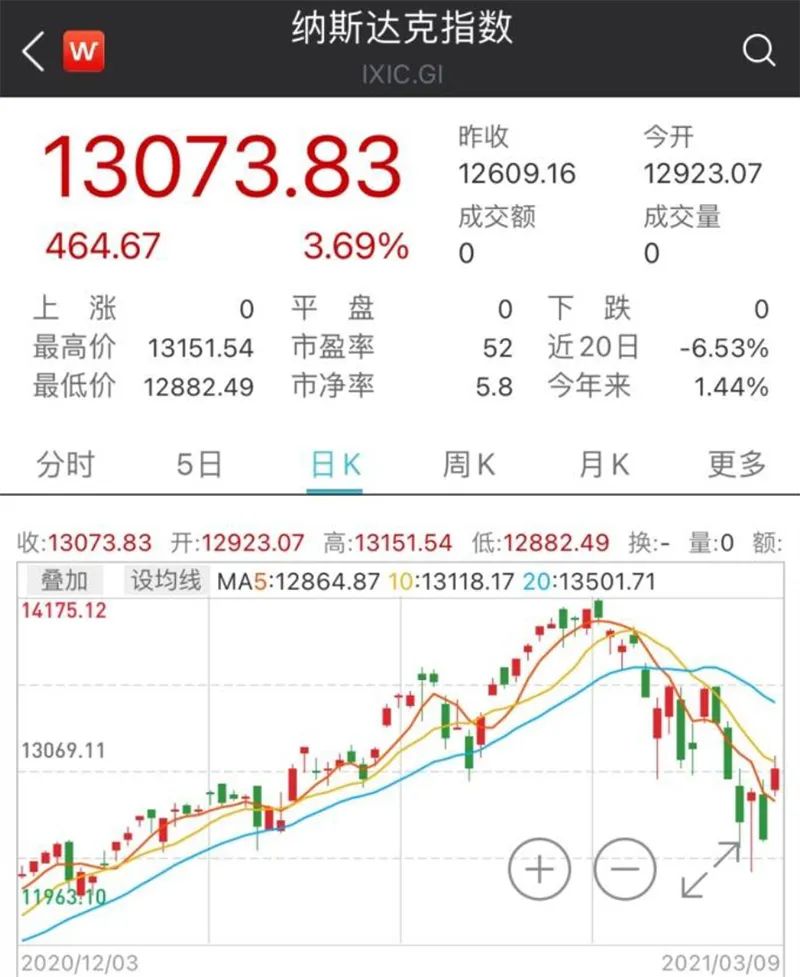 截至9日收盘时,纽约股市三大股指全线上涨。道指涨0.1%,标普500指数涨1.42%,纳指飙升3.69%。