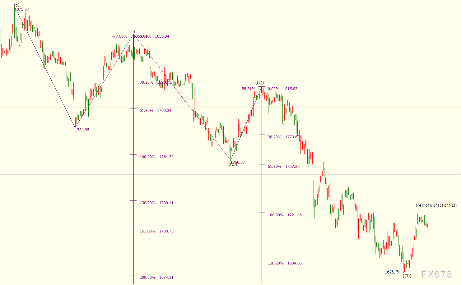 处于自1677美元开启的反弹((4))浪中,目前在1720美元附近遇阻。1720美元是始于1816美元的下行((3))浪的100%目标位,也是自1855美元开启的下行iii浪的150%目标位,((3))浪和((4))浪都是iii浪的子浪。