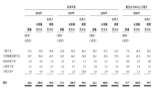 截至2020财年,顶级手套的手套产品中销量最大的为丁腈手套,销量达到293亿双,销量占比为47.2%。其次为天然橡胶乳胶手套,销量为261亿双,销量占比为42%。