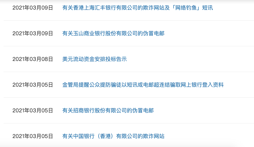 不仅在内地,香港金管局网站上近期也频频发布留意关于冒充中银香港、花旗银行、香港上海汇丰银行等名义发布的钓鱼短信,金管局提醒公众,银行不会透过短讯或电邮超连结,引领他们到其网站进行交易,更不会以电话、电邮及手机短讯(包括以超连结方式),要求客户提供任何敏感的个人资料(包括登入密码和一次性密码),呼吁市民提高警觉。