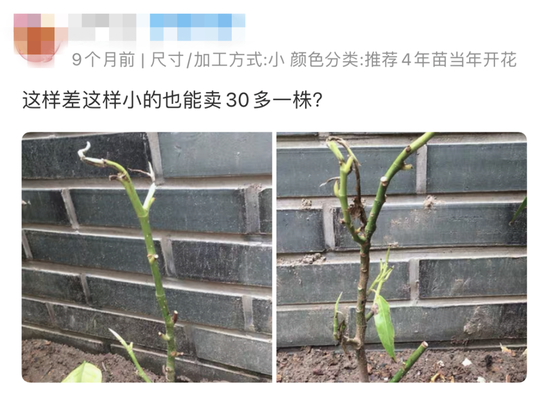 但记者点开后却发现不少消费者晒出的图片却是没有叶子的光杆。在该店的商品选项中,是按花苗的年龄来区分的,一位3钻消费者晒出一根近乎光杆的照片质疑道:“买的是8年苗,虽然不太懂,但也不相信这是8年苗,叶子就那么五六片……”