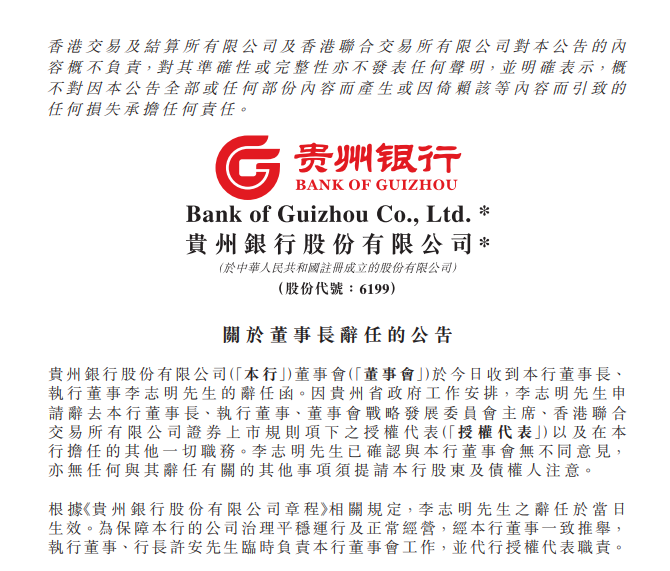 2021年1月28日,贵州银行发布公告表示,因贵州省政府工作安排,李志明申请辞去本行董事长、执行董事、董事会战略发展委员会主席、香港联合交易所有限公司证券上市规则项下之授权代表以及在本行担任的其他一切职务。