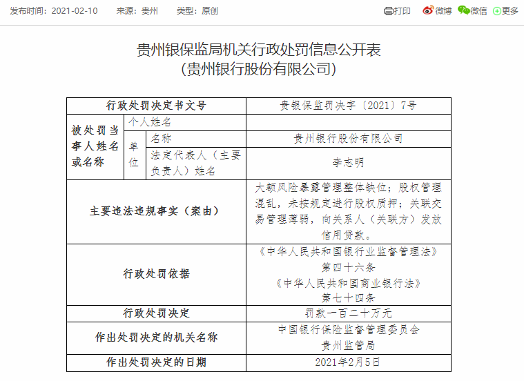值得注意的是,贵州银行近来罚单接到手软。单是在2月10日一天之内,银保监会网站便一次性披露16张罚单指向贵州银行及其相关责任人,处罚金额共计360万元。