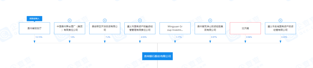 贵州银行被誉为“含茅量”最高的银行,因其第二大股东为茅台集团,截至2020年9月末,茅台集团持股比例高达12%。此外,据企查查信息显示,该行第一大股东为贵州省财政厅,持股比例为13.15%。