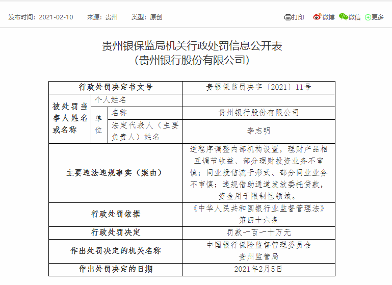 另一张罚单指出,贵州银行因存在“逆程序调整内部机构设置,理财产品相互调节收益、部分理财投资业务不审慎;同业授信流于形式、部分同业业务不审慎;违规借助通道发放委托贷款,资金用于限制性领域”的违法违规行为,贵州银保监局对其处以110万元罚款。