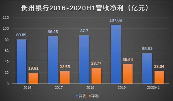 业绩方面,2016年-2019年,贵州银行的营收分别为80.69亿元、86.25亿元、87.70亿元、107.06 亿元;同期,该行净利润分别为19.61亿元、22.55亿元、28.77亿元、35.64亿元。