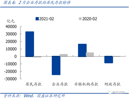 1)M1同比大幅走低主因春节错月,后续仍有望以较高增速增长。去年同期M2同比为4.8%,较1月基数提高4.8个百分点,其实本质反映的是春节错月的影响。即一般春节前月份,企业活期存款或取现需求增加,以备发放奖金。到了2月,企业奖金发放,企业活期存款向居民存款转移。作为印证,今年2月企业存款同比少增逾2.7万亿,同期居民存款同比多增近3.4万亿。往后看,PPI回升、企业盈利和现金流改善的趋势不变,仍将对M1形成支撑。