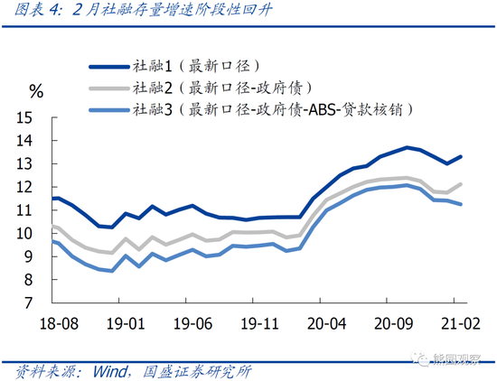 2.社融新增量和存量增速超预期,表内贷款和表外票据延续提供支撑,政府债券贡献度低,总量和结构均可反映企业融资需求旺盛。2月新增社融1.71万亿,同比多增8363亿元。社融存量同比增速回升0.3个百分点至13.3%,剔除政府债券口径的同比增速回升0.36个百分点至12.11%。总体看,2月新增社融再超预期,社融增速回升,主贡献延续1月的表内贷款和表外票据。往后看,我们维持全年社融增速回落2个百分点左右的判断,不过回落过程可能较为温和,后续政府债券发行节奏加快也将对社融带来支撑。