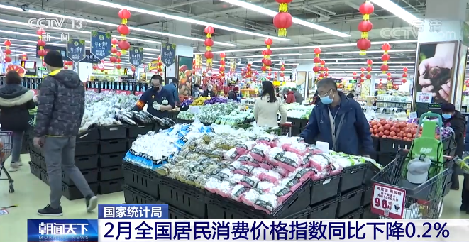 央视网消息:国家统计局昨天(10日)公布了2月份全国居民消费价格指数。数据显示,2月份CPI同比下降0.2%,降幅有所收窄。