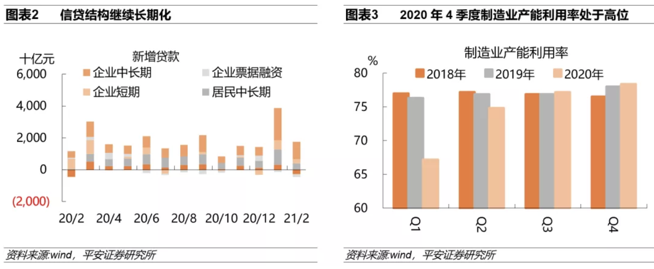 第一,经济内生性恢复后,企业尤其是制造业企业,扩大资本开支的意愿增强。2020年四季度制造业产能利用率达到了78.4%,处于近3年同期的高点。今年1~2月出口强劲,国家统计局有关领导在解读2月PMI时也称,多数制造业出口企业对近期外贸形势仍保持乐观。看好未来需求,但现有产能已经得到比较充分的利用了,企业有动力去增加资本开支,尤其是设备更新。政策也在引导加大对制造业企业发放中长期贷款,这为制造业企业提供了适宜的融资环境。