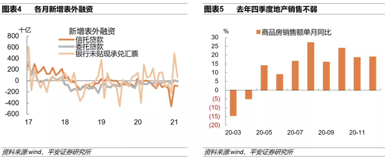 1月居民中长期贷款创下历史新高后,2月再次处在高位。主要原因是2020年四季度房地产销售火爆的滞后,因为从房产交易到贷款发放,中间存在2~3月的时间差。去年四季度开始收紧了热点城市的房贷政策,但从近两个月的新增居民中长期贷款来看,相关政策对总体的新增房贷规模影响不大。目前房地产销售回款占房企资金来源的比例已超过50%,居民中长期贷款这么强,能够缓和融资政策收紧后对房企的冲击。后续房贷政策如果没有大幅收紧,那么地产投资尤其是建安投资断崖式下跌的概率很小。