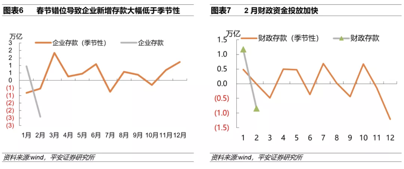 M1同比从14.7%下降到7.4%,接近腰斩,春节错位下的高基数对此有较大影响。M2同比从9.4%提高到10.1%,原因一是新增信贷超预期后,银行体系所创造的存款也在增加;原因二是财政存款投放加快,转化为居民和企业存款。